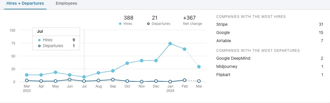 The data tells the tale of Anthropic, a derivative of the well-known OpenAI company has grown 238% (388 staff members) in the last 12 months alone: